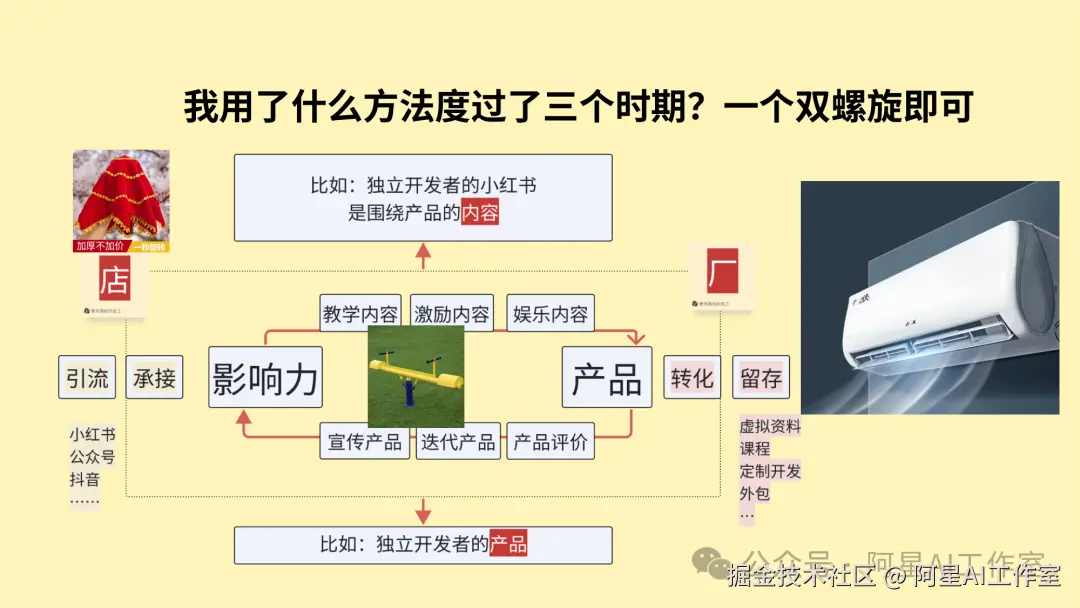 自媒体和独立开发的双螺旋。一边是内容,一边是产品;内容把人带过来,产品承接需求;产品迭代又变成新的内容,内容再带来新的用户。