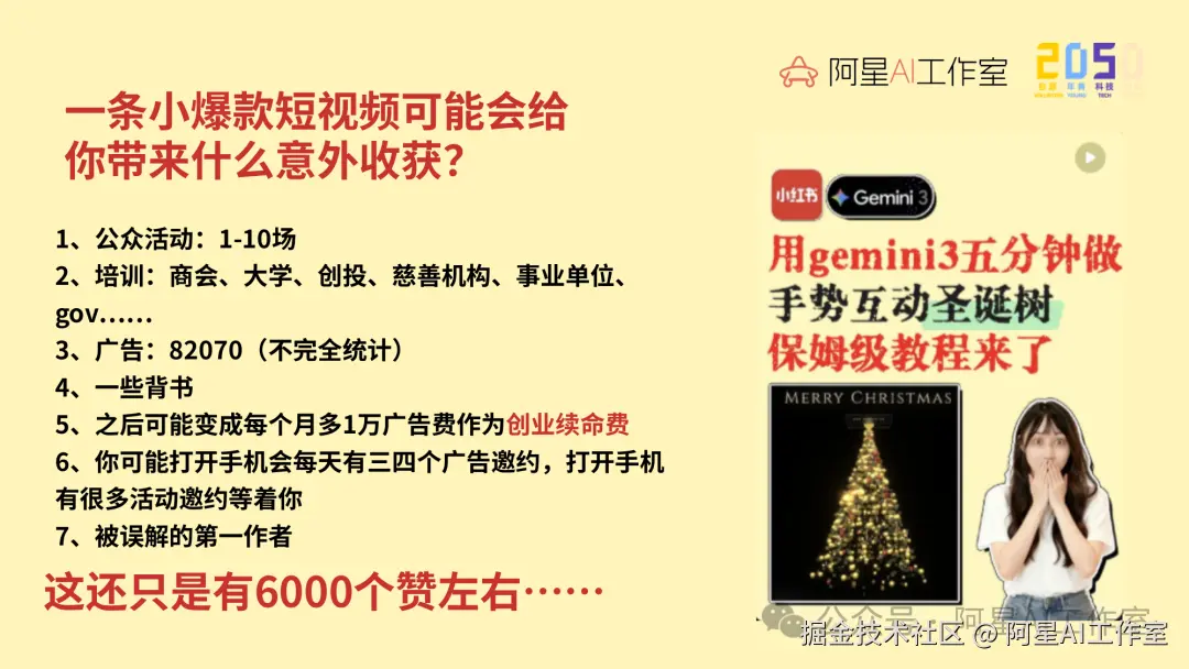 我自己有一条短视频,点赞也就 6000 多,但后面带来的公开活动应该超过十场。那条视频讲的是一个普通人能看懂的效果:对着圣诞树做 Three.js 和 MediaPipe 相关的视觉互动,再对着电脑比划一下,用录屏软件录下来。它不复杂,但它可视化,普通人能看懂。