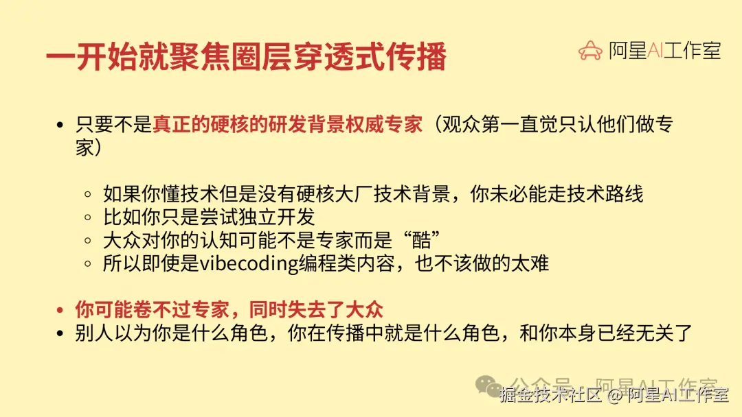 一开始还要做圈层穿透式传播。不是所有人都适合上来就走“技术专家”路线。