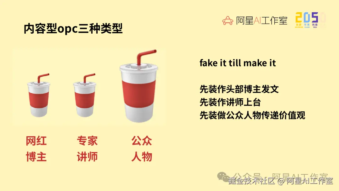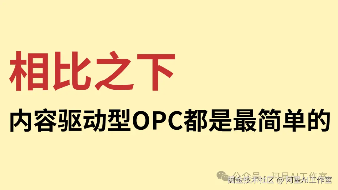 OPC 的类型有很多,有做 Agent 的,有做产品的,也有做技术服务的。你要是有小天才那种天分,就不用听我讲这个,直接去干就行了。但对大部分普通人来说,能力上限、资源上限,以及能驾驭社会的水平,比较现实的路径其实就是内容驱动型 OPC。