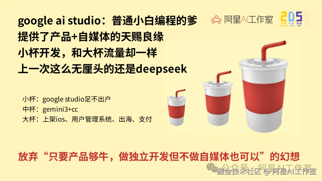 工具选择上,如果你没有编程基础,就用 Google AI Studio 这种更适合小白的工具。相比 iOS 上架、Claude Code、Antigravity 这种更有门槛的路径,Google AI Studio 对普通人更友好。你不用打开 IDE,也不需要一开始就进入很重的工程环境。