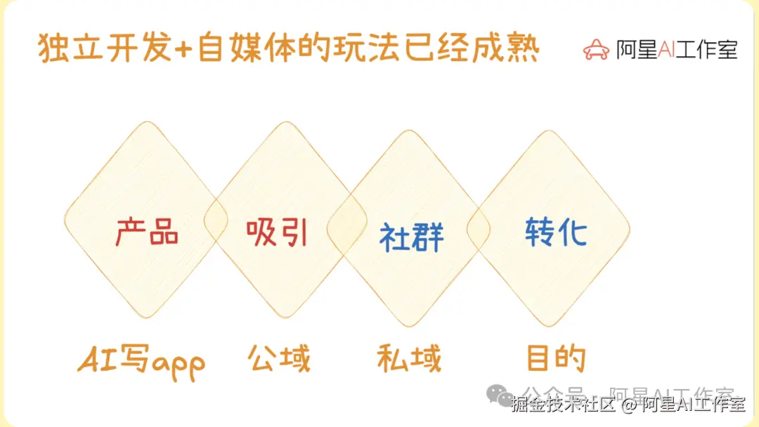 独立开发加自媒体,其实已经是很成熟的玩法了。AI 写 App,做一个 vibecodingDemo,引流到公众号、公域,再引流到社群,在社群里转化。比如你做龙虾部署教程,写一篇公众号,引流到社群,这就是一个每个独立开发者都可以直接使用的结构。你发多了,就会慢慢知道哪些是用户喜欢的,哪些是同行喜欢的。同行不喜欢,不代表流量会差。