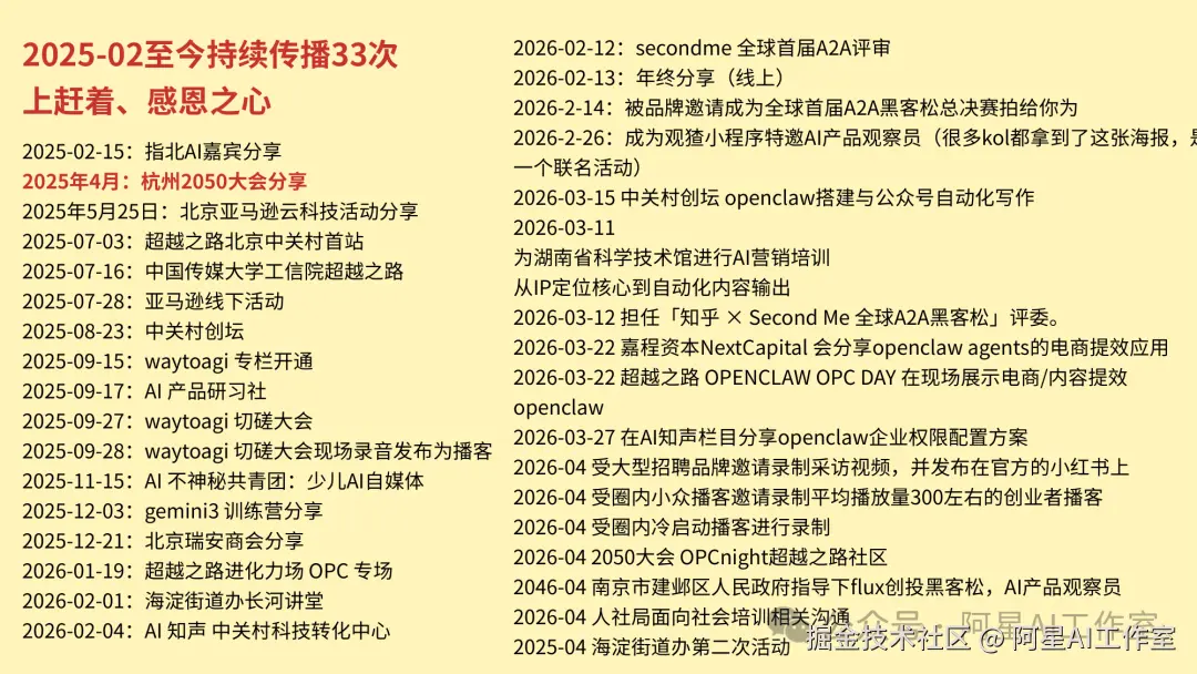 不需要你一开始就有团队,不需要你一开始就融资,也不需要你一开始就有多么复杂的技术能力。它考验的就是你能不能持续表达、持续行动、持续把自己往外推。
