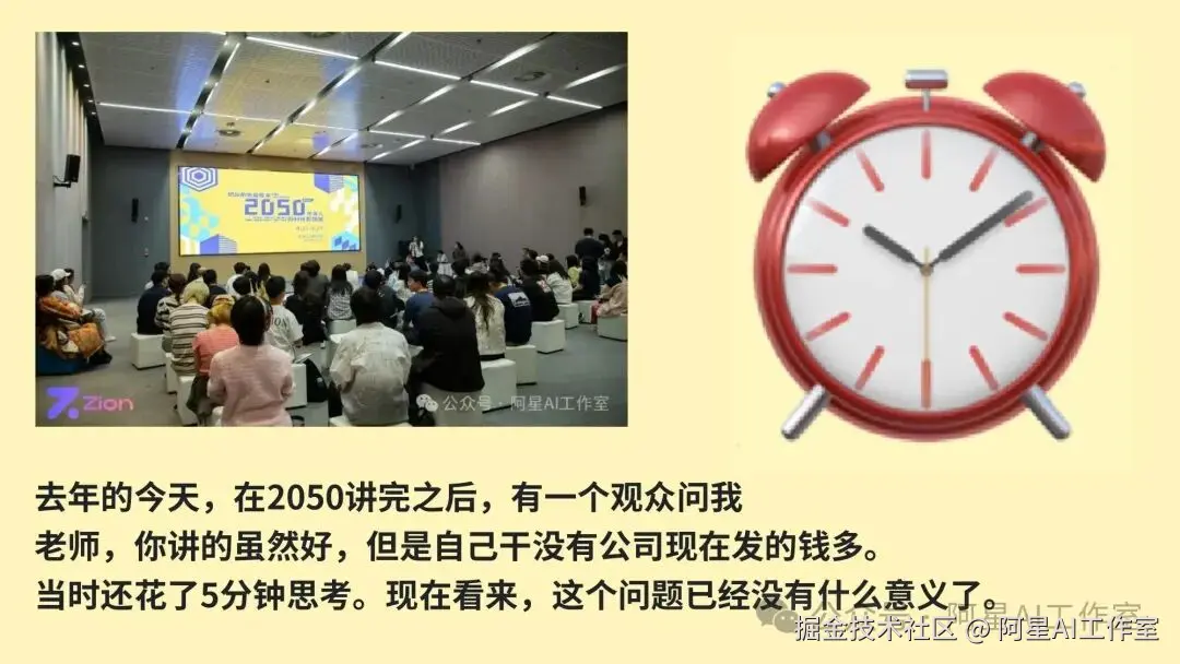 所以早期一定要允许自己制造噪音。60 分的人可以教 30 分的人,90 分的人可以教 60 分的人。你不能永远等自己变成大师,再去教别人、发内容、做分享。等你真的觉得自己可以了,AI 红利可能都快过去了。只当观众肯定会后悔,这个是一定的。