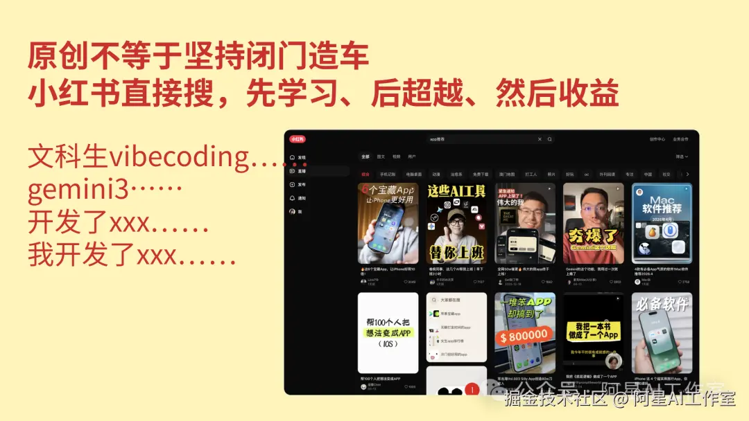 还有一个数字,300 条。有人拍了 300 条视频才火,而且那个时候 AI 还没有现在这么火,拍 300 条可能也没有什么水花。现在 vibecoding变成小红书的主推议题,所以才火了一批 KOL。但你不能只看到别人火了的样子,看不到人家前面拍了多少条。