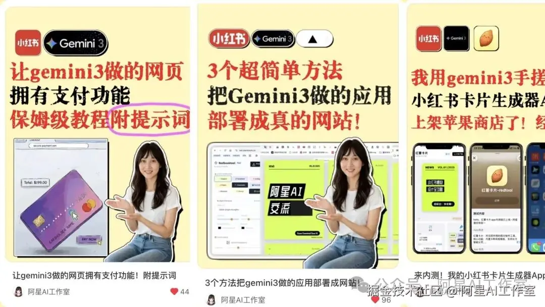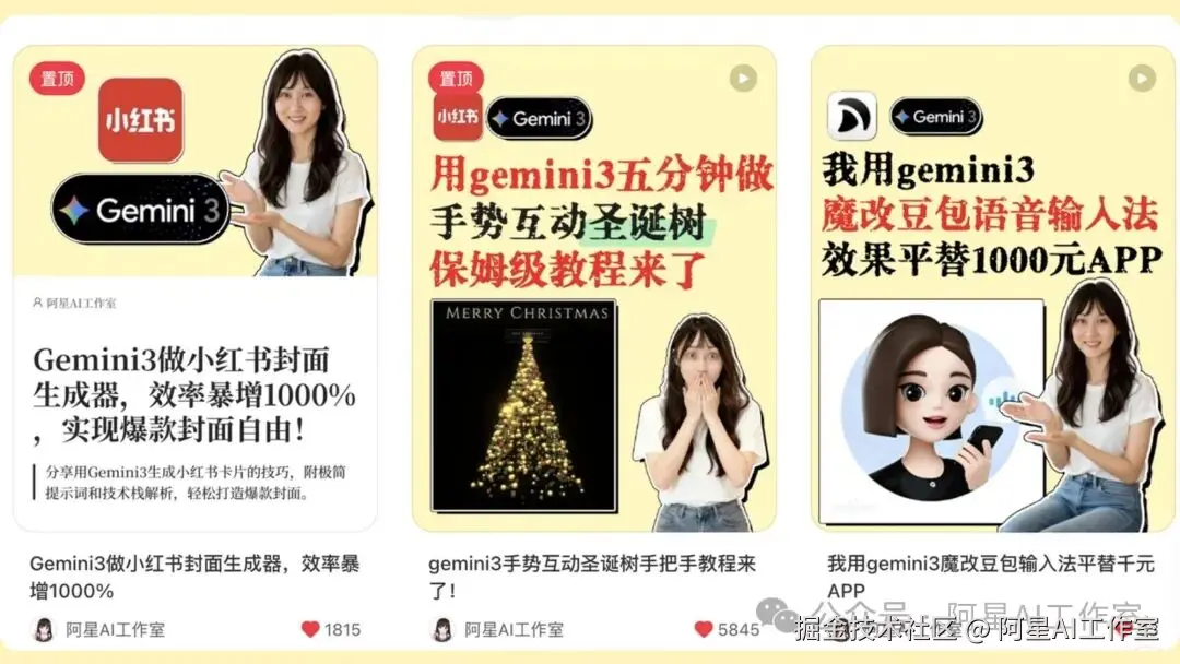 所以很多时候,你要做关键词,也要会蹭关键词。比如 Gemini 3 加提示词、部署、卡密、小魔术生成器、iOS Swift、React 前端、Three.js、豆包语音输入法,这些选题都可以自己改自己,自己凹自己。不是为了蹭而蹭,而是你要让自己的作品进入公共叙事。