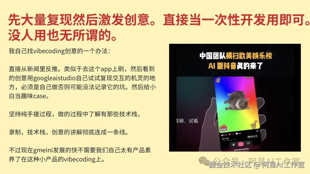 具体做内容的时候,不要把“原创”理解成闭门造车。你可以多看别人做什么,刷到好的创意,自己打开 Google AI Studio 做一版。现在很多海外项目、国内自媒体内容,都已经很有创意了。你不是照搬别人的东西,而是在别人的工作基础上更新、改造、变成自己的选题。