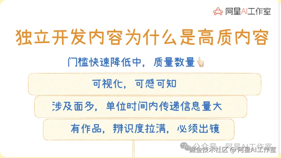 大量工具号会非常同质化,比如每天一个 GitHub 精选,这种我建议大家不要做。别人记不住你,只会记住那个工具。你应该做技术项目,做独立开发,做可视化,做露脸表达,在单位时间内给出足够大的信息密度,让别人觉得不收藏都可惜。