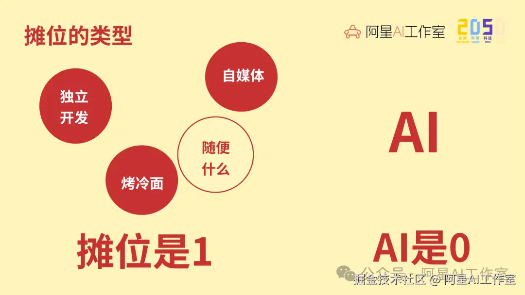 比如你是开烤冷面的,那就是烤冷面加 AI;你是开饺子馆的,那就是饺子馆加 AI;你是做自媒体的,那自媒体就是你的摊位。AI 不能只是 AI,因为它本身没办法直接产生商业价值。它必须落到一个摊位上。