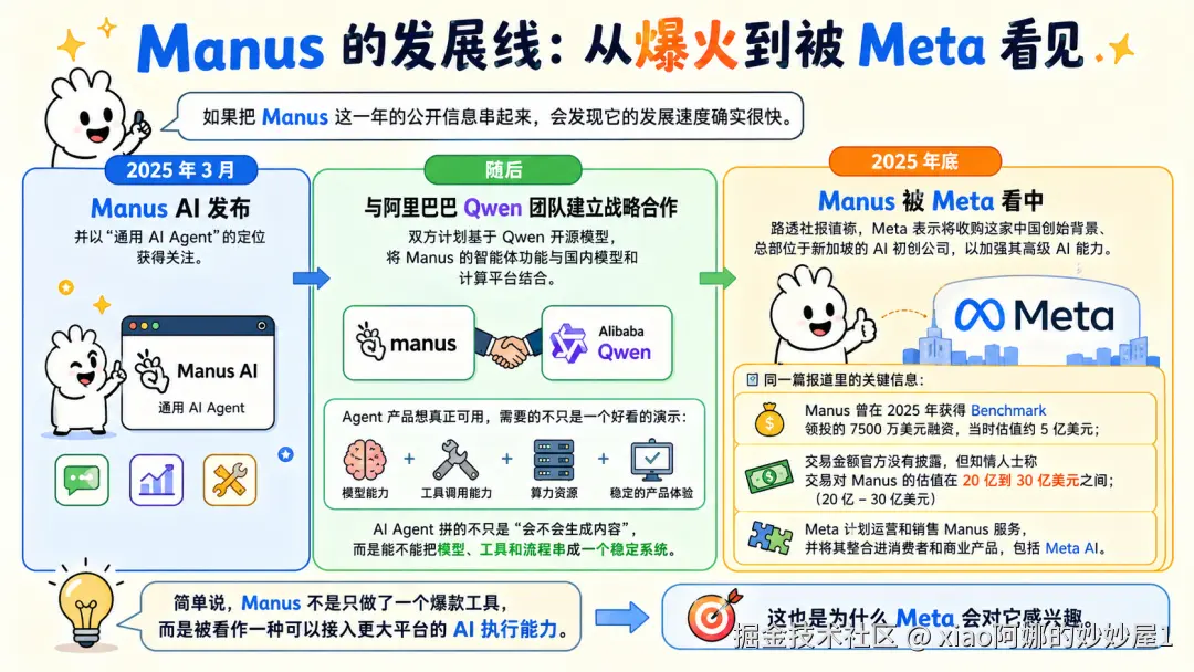 从 2025 年 3 月爆火,到与 Qwen 团队合作,再到被 Meta 收购,最后又因为收购事项进入更多公共讨论,Manus 的经历像是一个缩影:AI Agent 正在从一个新鲜概念,变成大厂、创业公司和普通用户都不得不重视的产品方向。