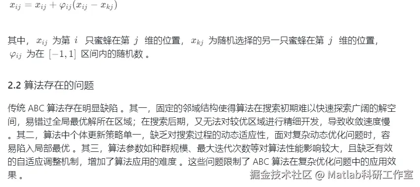 在科学研究与工程应用领域,优化问题普遍存在,如资源分配、参数优化、路径规划等 。人工蜂群算法(Artificial Bee Colony,ABC)作为一种模拟蜜蜂觅食行为的智能优化算法,因其结构简单、易于实现且在全局优化任务中展现出良好性能,在众多领域得到广泛应用 。然而,随着实际优化问题复杂度不断提升,问题的搜索空间往往呈现动态变化、高度非线性等特性 。传统 ABC 算法采用固定的邻域结构进行个体搜索更新,这种固定模式难以适应复杂动态搜索空间,导致算法在探索新区域和开发已有较优区域时无法灵活切换,易陷入局部最优,降低优化效率和精度 。因此,改进传统 ABC 算法,提高其在复杂动态环境下的优化能力,对解决实际优化问题具有重要的现实意义 。