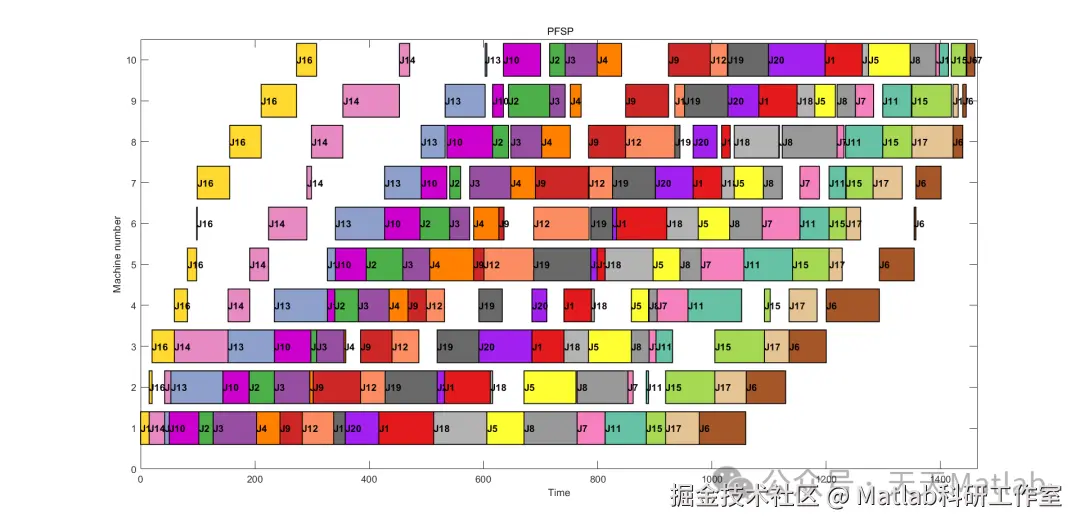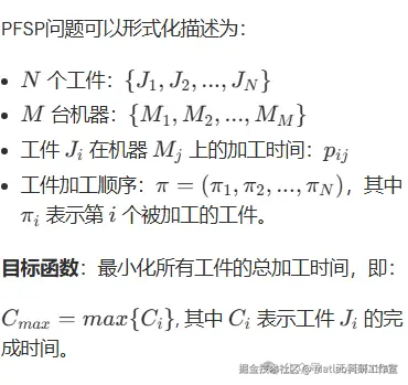 置换流水车间调度问题(PFSP)是指在流水车间中,将n个工件在m台机器上进行加工,每个工件都需要经过所有机器,且每个机器同一时间只能加工一个工件。每个工件在不同机器上的加工时间不同,且工件的加工顺序是可以任意调整的,目标是找到一种最佳的工件加工顺序,使得所有工件的总加工时间最小。