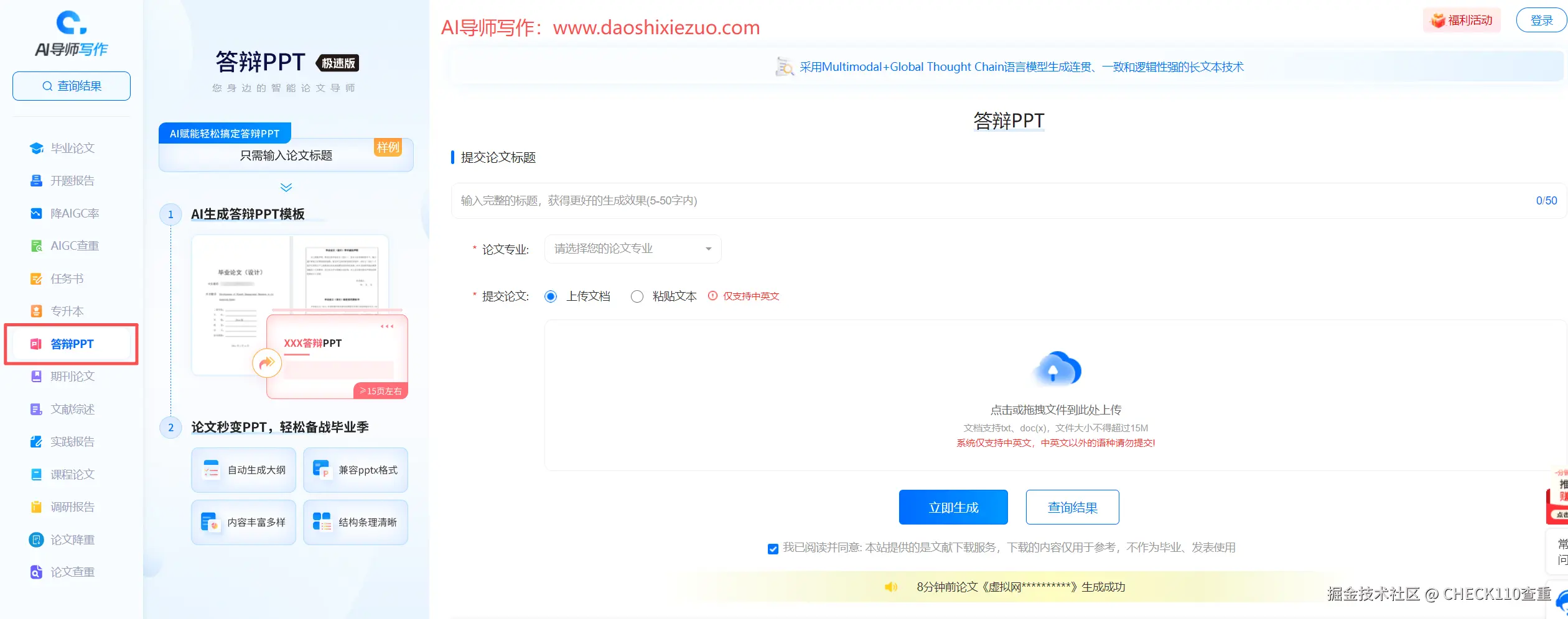 ✅ 用好工具能省不少心。 “AI导师写作”的答辩PPT功能,输入标题上传论文后就能自动生成答辩PPT,之前的论文初稿思路就靠它,现在做答辩PPT一样能用。
