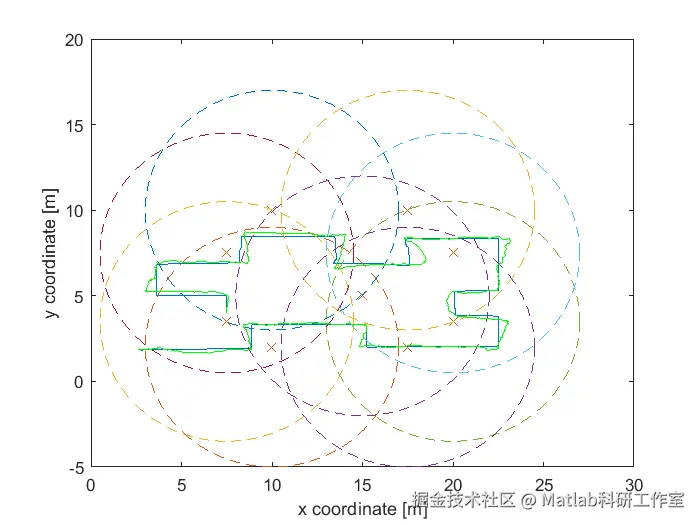 plot(radiuscos(t)+s(j,1),radiussin(t)+s(j,2),'--');