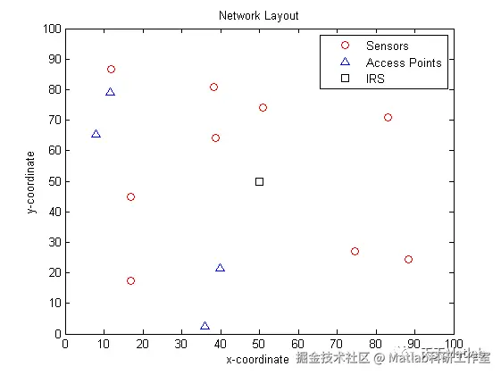 此代码模拟无线传感器网络 (WSN),其中包含特定数量的传感器、接入点和智能反射面 (IRS)。在此 WSN 中,传感器直接或通过 IRS 与接入点通信。该代码根据给定的路径损耗指数计算路径损耗,随后从中导出相应的信号功率和信噪比 (SNR)。然后,SNR 和网络布局在单独的图中可视化。