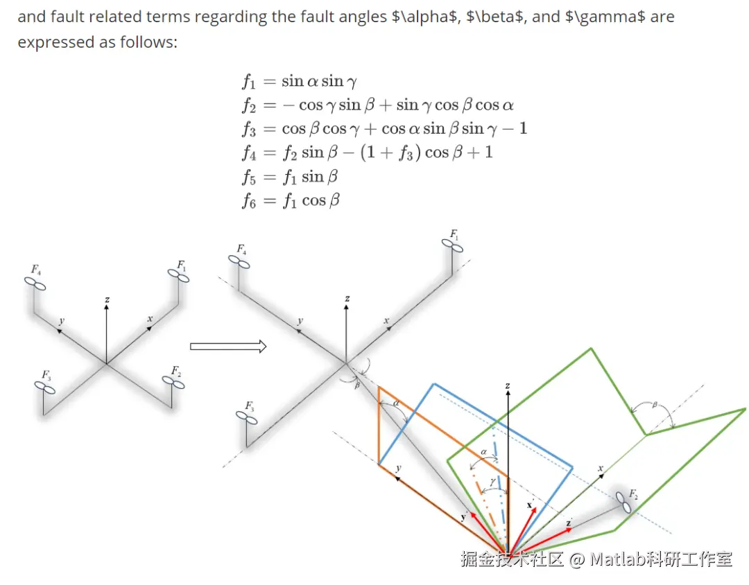 单臂结构故障:机臂长度变化、刚度下降导致电机安装位置偏移,推力矢量方向改变,动力学模型中的惯性矩阵、阻尼矩阵参数突变;