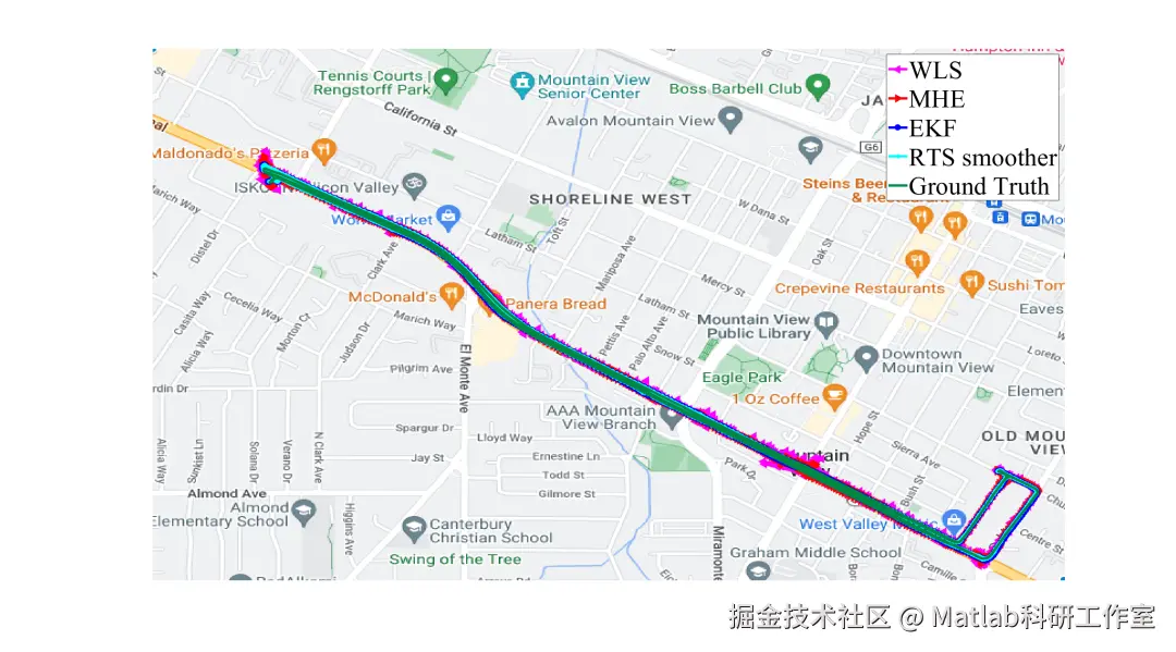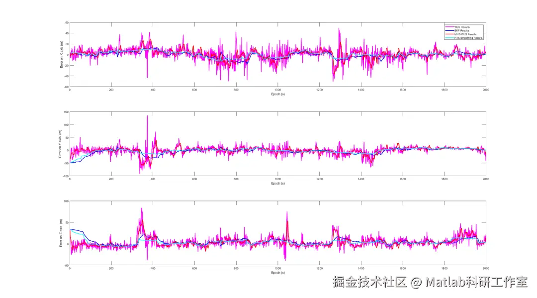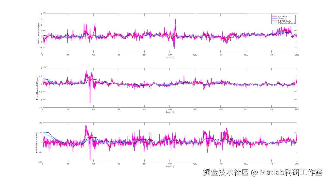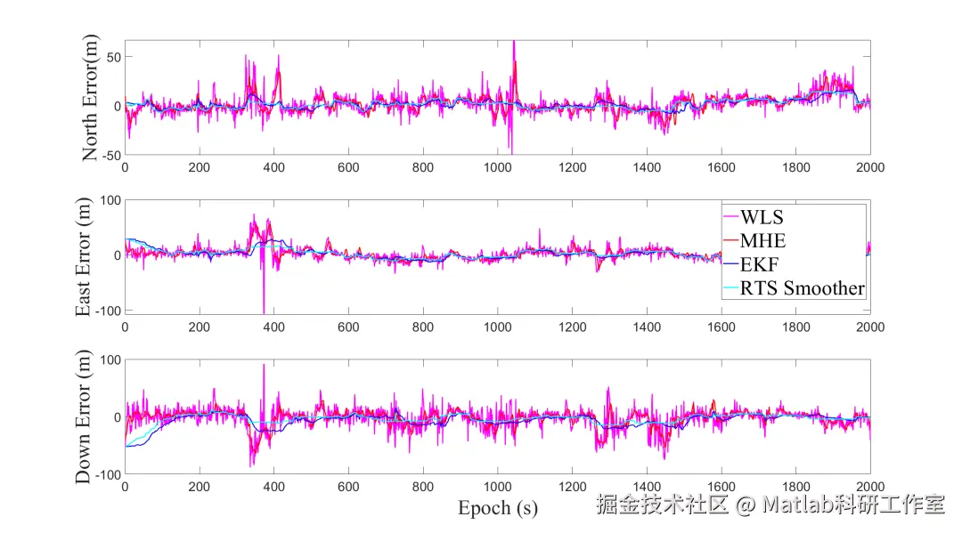 全球导航卫星系统测量数据处理与定位算法对比MATLAB脚本,对比 WLS、EKF、MHE、RTS算法