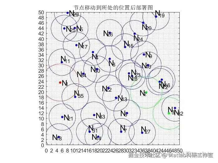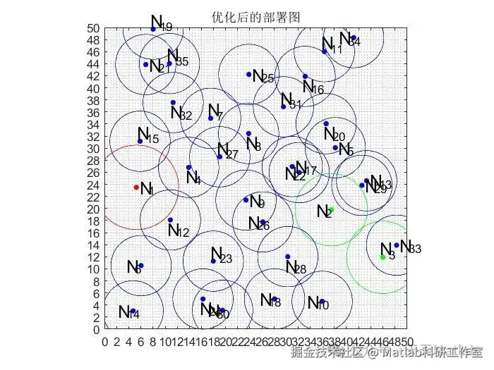 2. 适应度计算:对于每个烟花(节点部署方案),计算其覆盖率、能量消耗率和节点浪费率,并综合这三个指标得到适应度值。适应度值越高,表示该部署方案越好。