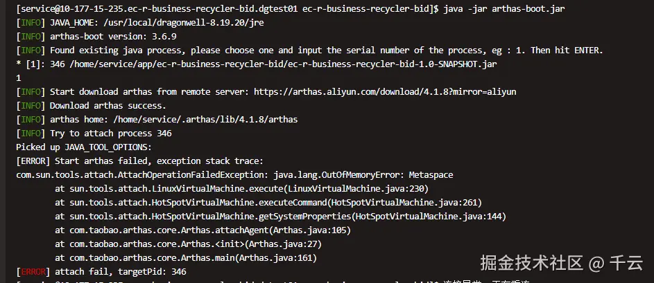 java.lang.OutOfMemoryError: Metaspace异常。 - 关键启示:Arthas本身运行需要JVM空间,此错误说明JVM的元空间(Metaspace)已满,无法再加载任何类(包括Arthas的Agent)。