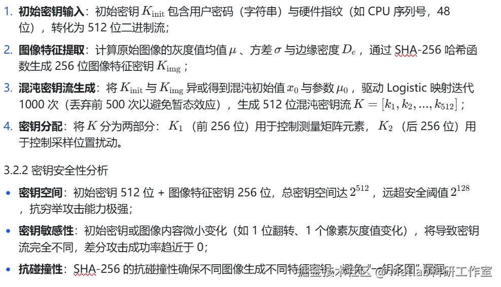 密钥生成阶段:输入初始密钥(用户密码、硬件指纹等)与图像内容特征,通过混沌 - 哈希融合机制生成密钥流,用于控制测量矩阵设计与采样位置扰动;
