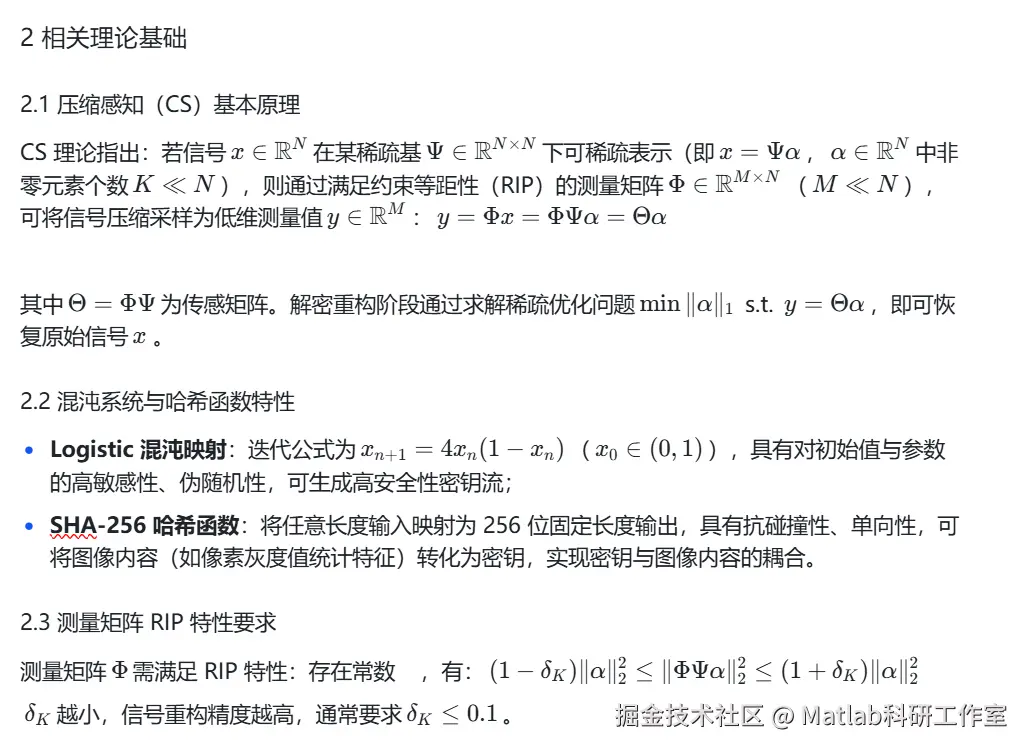 近年来,顶刊相关研究主要集中于三方向:① 混沌测量矩阵设计(如《IEEE Access》提出的 Logistic 混沌矩阵,但密钥敏感性不足,易受混沌退化影响);② 压缩加密一体化优化(如《Signal Processing》的 CS+DNA 编码方案,但复杂度高,重构精度低);③ 密钥与图像内容耦合(如《中国科学:信息科学》的哈希密钥控制方案,但测量矩阵 RIP 特性难以保证)[6-8]。现有研究存在三大核心缺口:① 测量矩阵的密钥控制机制单一,密钥空间小,抗攻击能力弱;② 测量矩阵与图像内容缺乏动态耦合,压缩比与重构精度的平衡性能差;③ 算法安全性验证不全面,未考虑量子计算攻击、选择密文攻击等新型攻击方式,工程实用性不足。