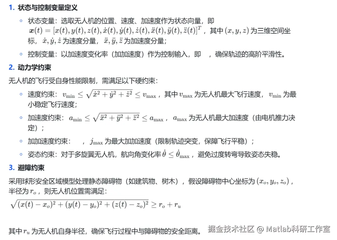 无人机轨迹优化的核心是在满足各类约束条件的前提下,实现预设目标(如能耗最小、时间最短、轨迹平滑)的最优解。基于无人机的运动特性与实际飞行需求,构建如下数学模型: