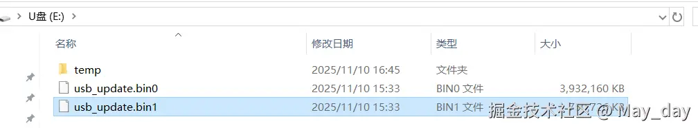 3.注意:串口维修包只需要烧录一次;后续每次更新固件,再次烧录的话,若使用U盘进行烧录,需要遵循以下步骤: ①将固件包存放于U盘根目录: