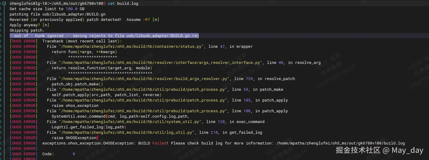⑥解决冲突后仍然报错,可以添加编译参数:--no-patch 暂时绕开这个问题,以快速验证当前修改;