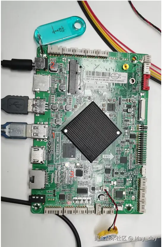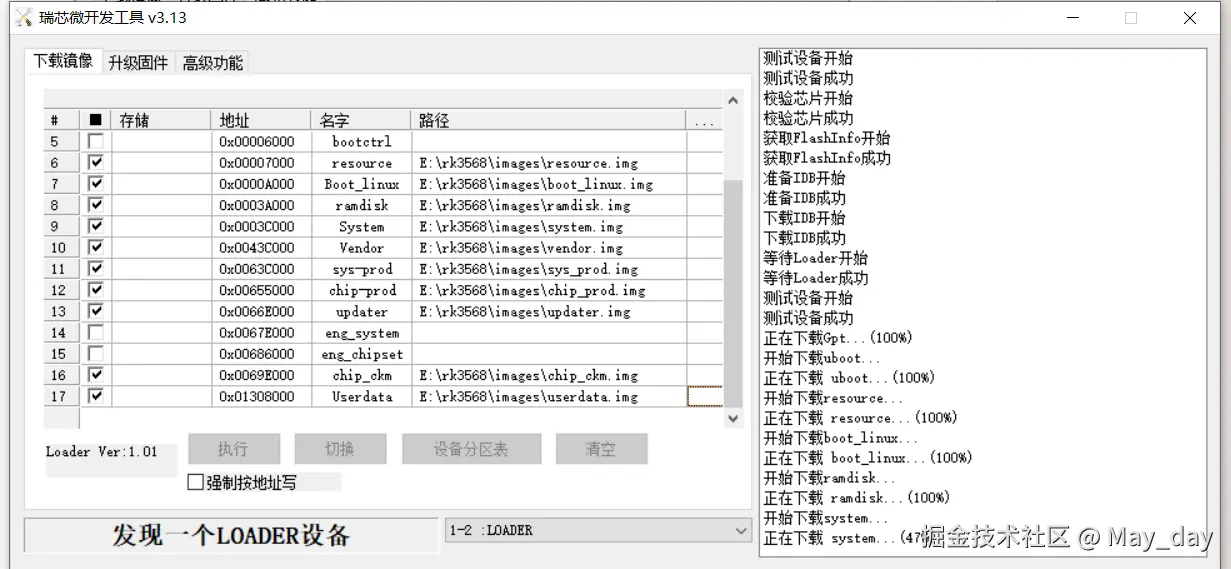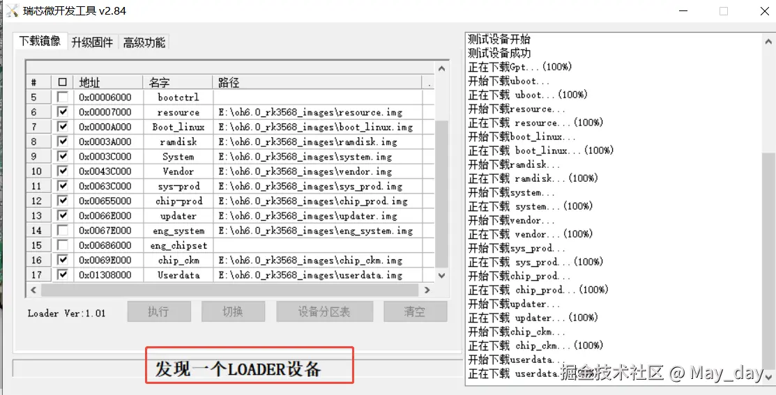 3.这里通过USB3.0连接主板和pc,断电上电同时按住复位键(3)后,发现loader设备以后,点击“执行”开始烧写