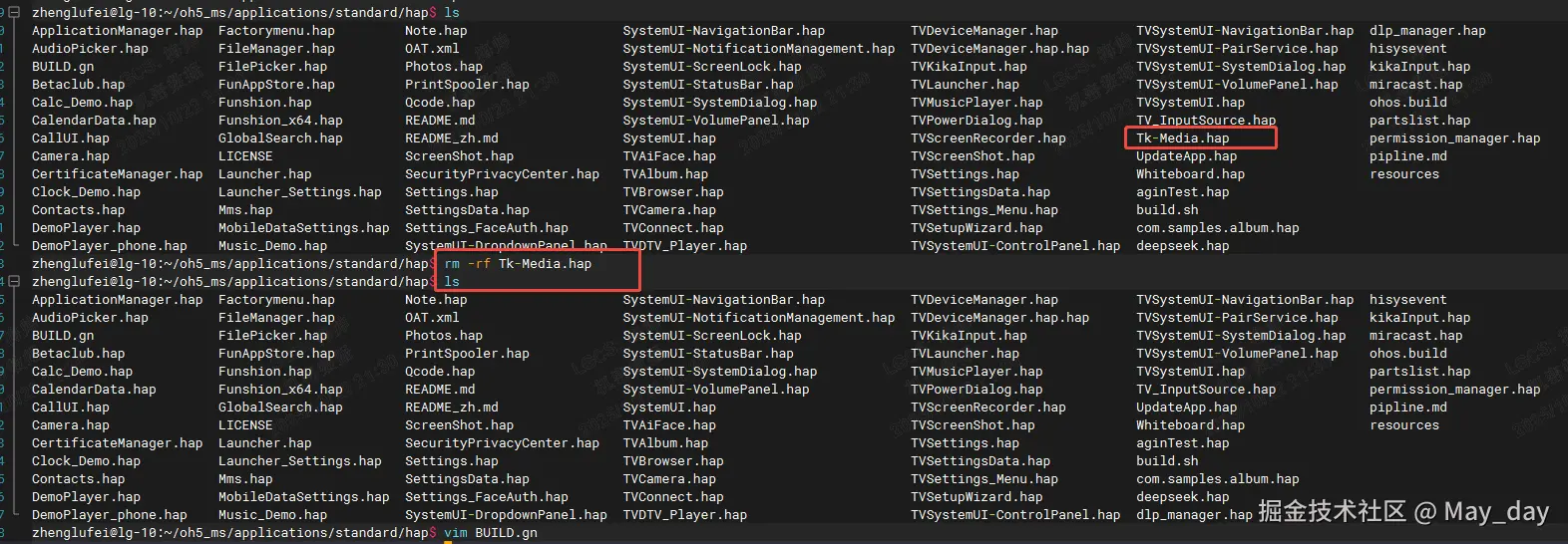 ①删除源码中的 Tk-Media.hap 文件 先执行删除操作: bash rm -f ~/oh5_ms/applications/standard/hap/Tk-Media.hap