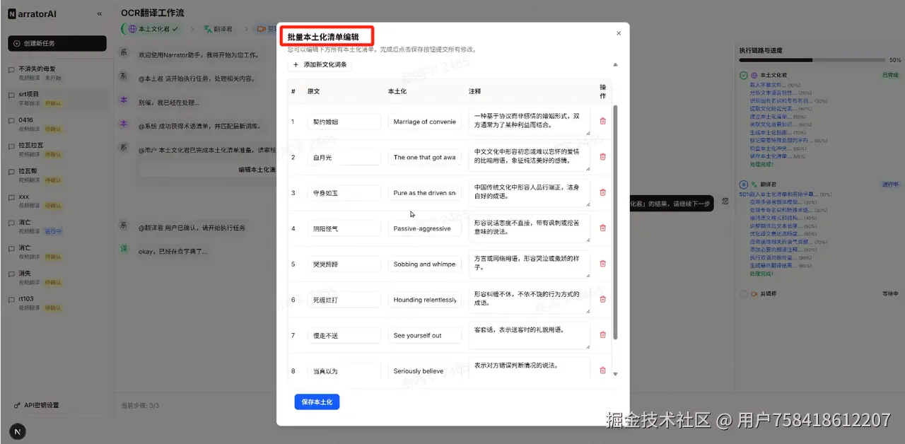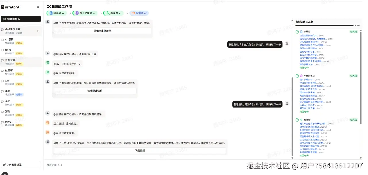这条路线的核心卖点是流程管控。把翻译拆成明确的环节(提取→本土化→翻译→压制),每个环节都能看到中间结果、能编辑、能确认后再往下走。不是"黑箱直出",而是"每一步你都知道发生了什么"。