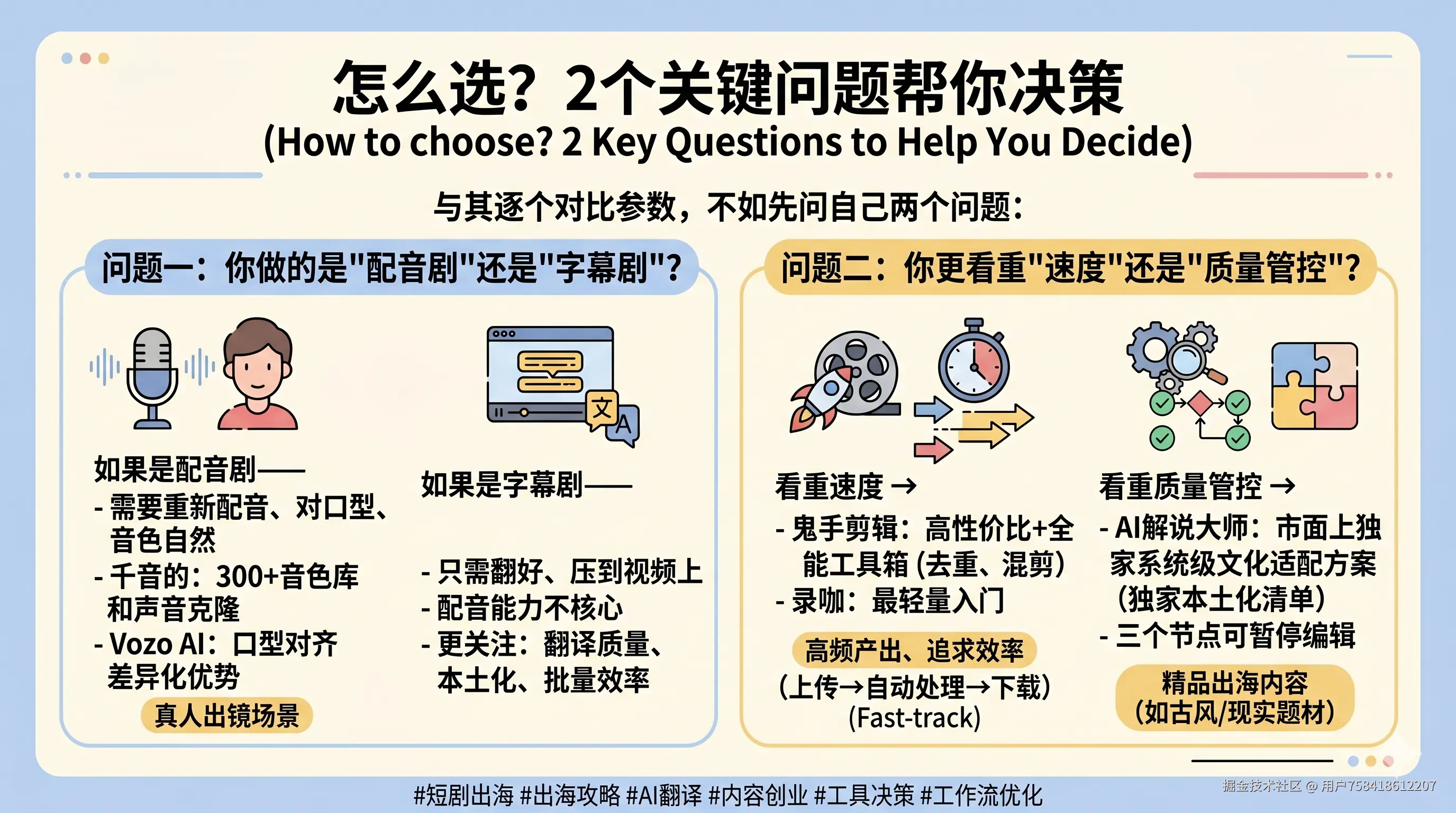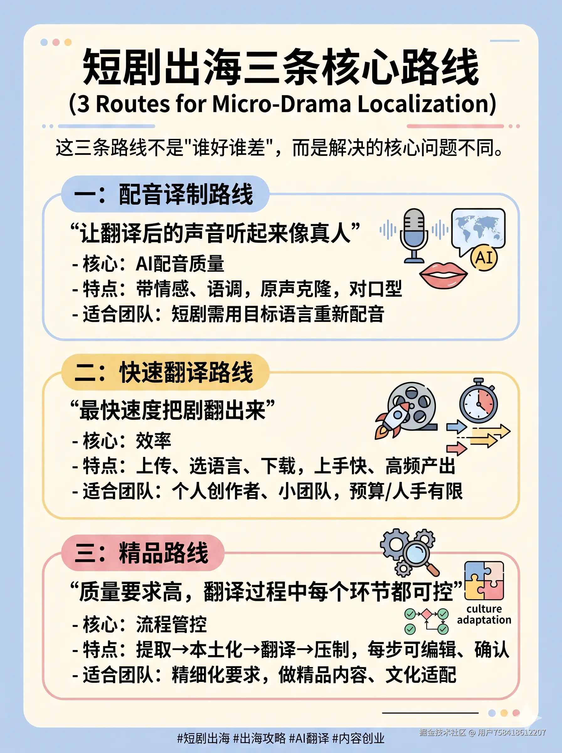 没有"最好的工具",只有"最适合你团队当前阶段的路线"。想清楚你要解决的核心问题是配音、速度还是质量管控,答案就很清楚了。