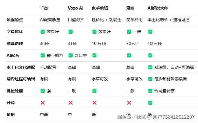 这5款工具我按使用感受分成三类——有的强在配音,有的强在快,有的强在翻译质量可控。没有哪款是完美的,关键看你最在意什么。每条路线选几款代表产品做横向对比,帮你搞清楚哪条路线适合你的团队。