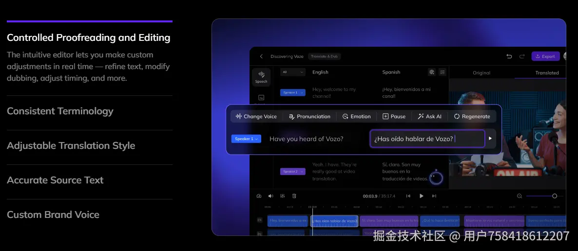 这条路线的核心卖点是AI配音质量。翻译只是其中一环,更重要的是把目标语言的配音做到"听不出是AI配的"——带情感、带语调、能克隆原声、甚至能对口型。