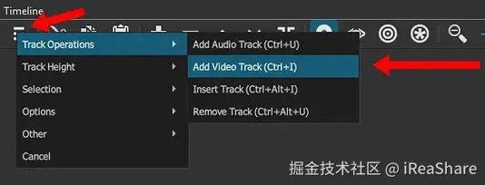 在 Shotcut 中打开视频,并将其拖到“时间线”上。然后右键单击轨道头,选择“轨道操作”>“添加视频轨道”。
