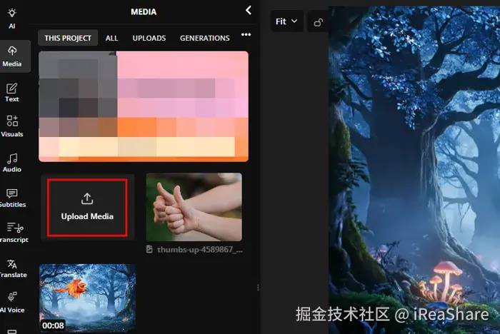 前往 Kapwing 工作室并上传您的视频。点击“上传媒体”导入您的徽标,或点击“文本”创建水印。