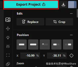 选择徽标片段,转到“滤镜”面板,点击“ + ”,然后搜索“大小、位置和旋转”。根据您的喜好调整徽标。最后,点击“导出”并选择所需的预设。