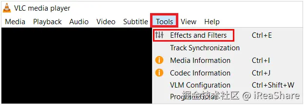 如果没有VLC播放器,请下载并安装。然后转到“工具”>“效果和滤镜”。