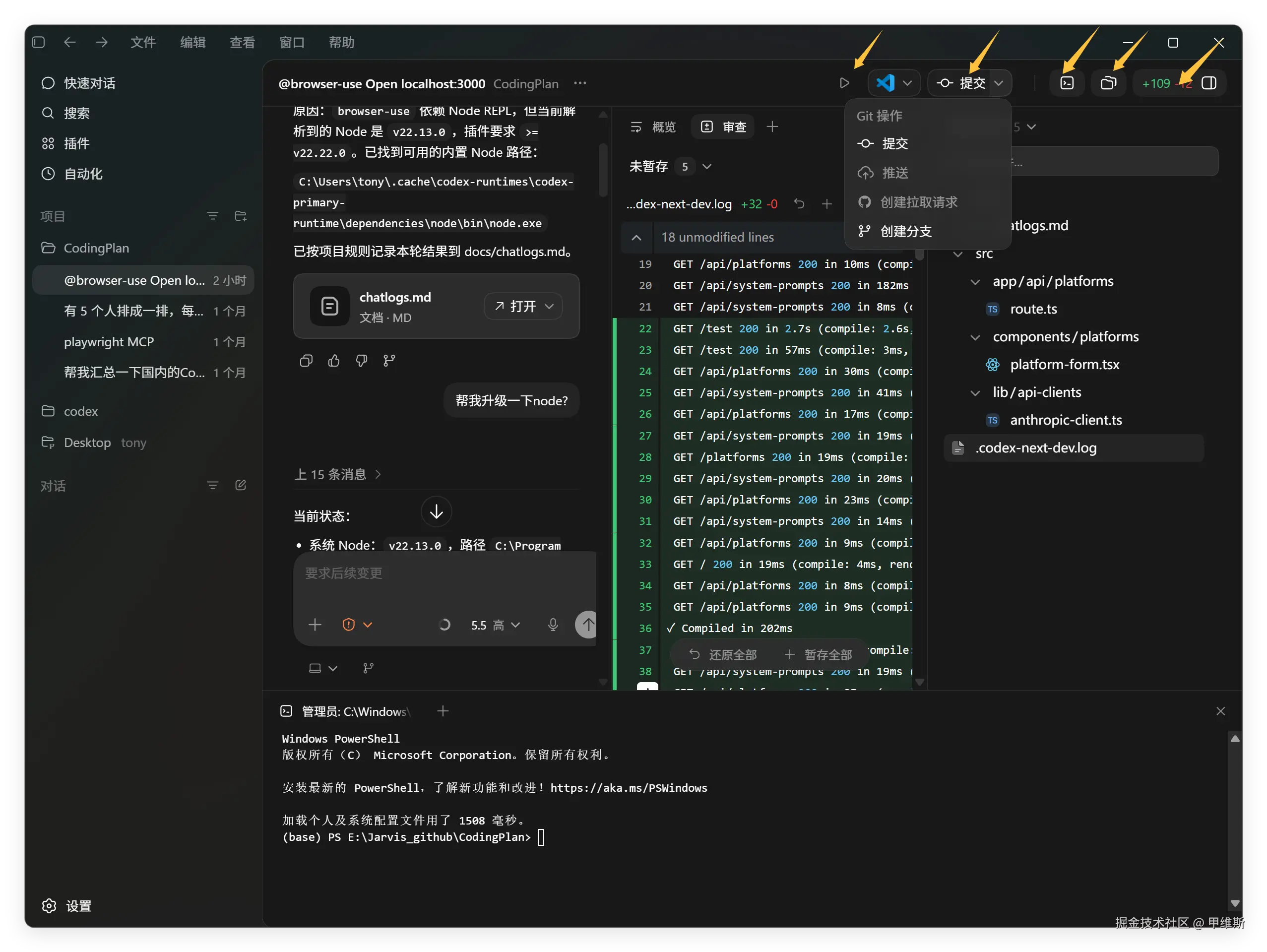 除了浏览器的使用之外,Codex 的开发相关功能也非常齐全。