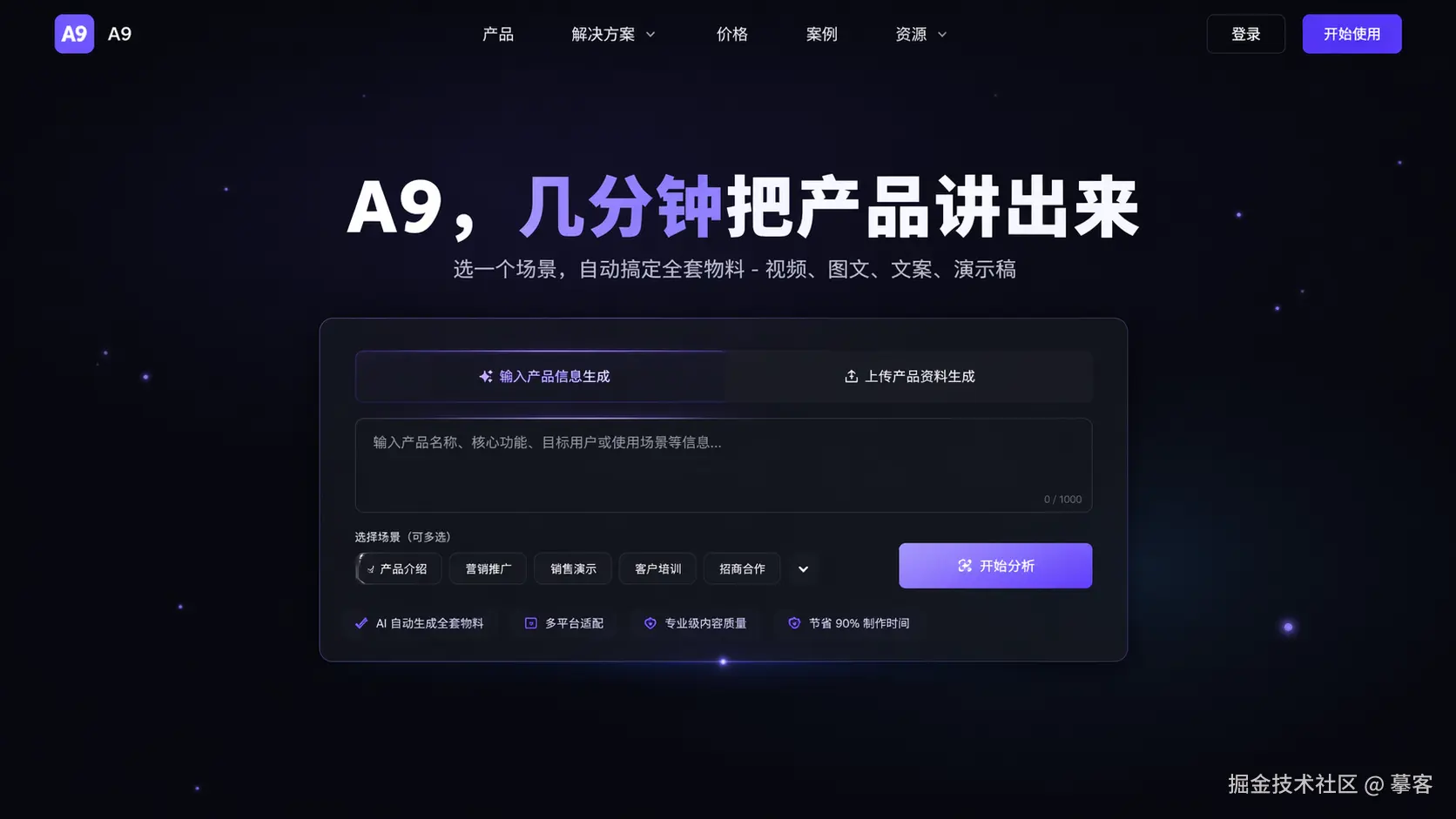 推荐理由:大多数独立开发者卡的不是“没工具”,而是要用5个工具(写文案+做图+剪视频+排版+改PPT)出一套物料,光这一项每周就吃掉两天。A9是目前少有的“一站式营销物料Agent”,把这件事的时间从一周压缩到一小时。