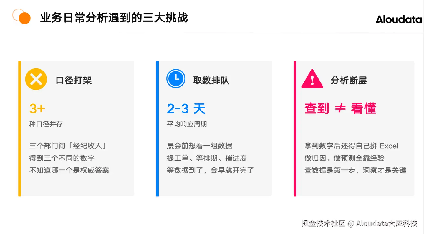 当前,业务人员并不缺乏分析工具。企业通常已配备 BI 报表系统、数据中台以及各类大模型应用。然而,工具虽多,业务分析还是会面临以下痛点: