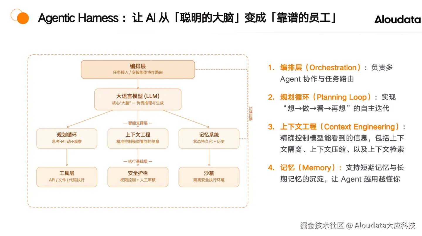 此次 Aloudata Agent 升级的核心在于架构革新——采用前沿的 Agentic Harness 架构,完成了系统能力的跃迁。Agentic Harness,本质上是一层围绕大模型构建的运行框架:它负责理解任务、调度技能、调用工具、控制上下文、沉淀记忆,并对关键结果进行验证与纠偏。大模型负责“思考”,Harness 负责“把思考变成稳定可执行的工作流程”。