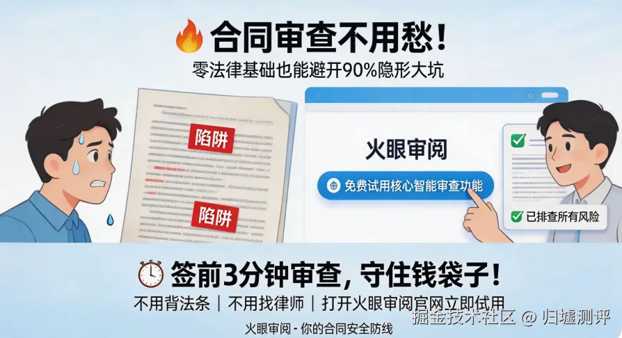 现在打开火眼审阅官网,就能免费试用核心智能审查功能,不用背法条、不用花高价找律师,也能稳稳守住自己的权益,再也不用为合同里的隐形坑提心吊胆。