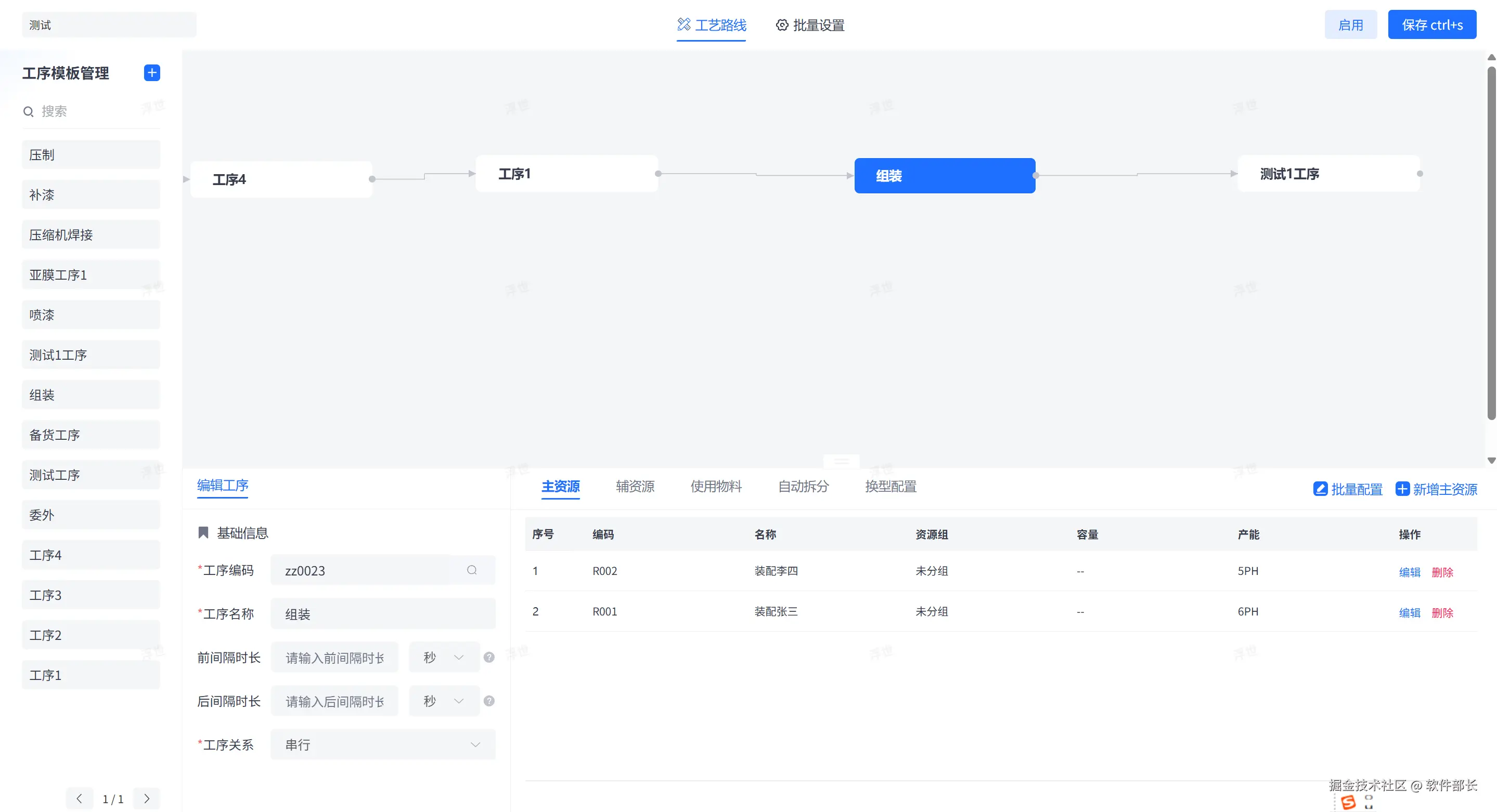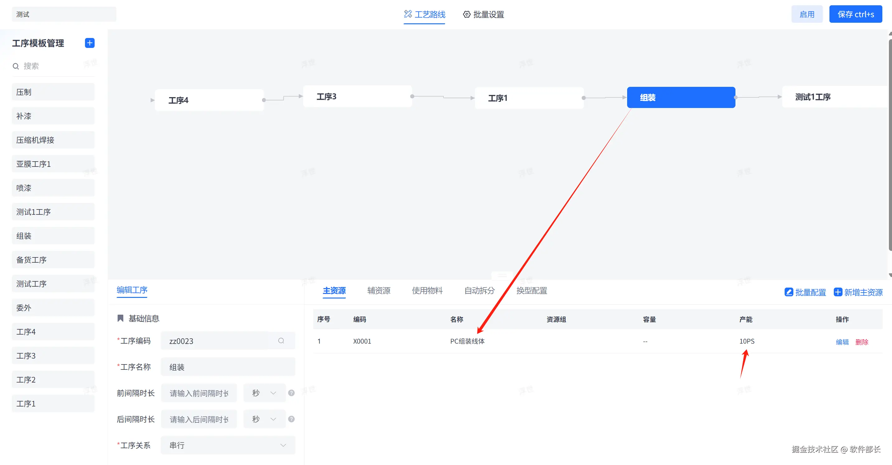 - 可视化配置:主资源池化其实本质上就是把资源设置为一个虚拟的设备,在系统的工艺路线画布中, planners(计划员)可以直接拖拽工序,并在该工序的“主资源备注(设备配置)”中,例如下图中把某个产线设置为一个虚拟设备,可以在工艺线路中设置 虚拟设备的产能 去调整资源池生产的效率: