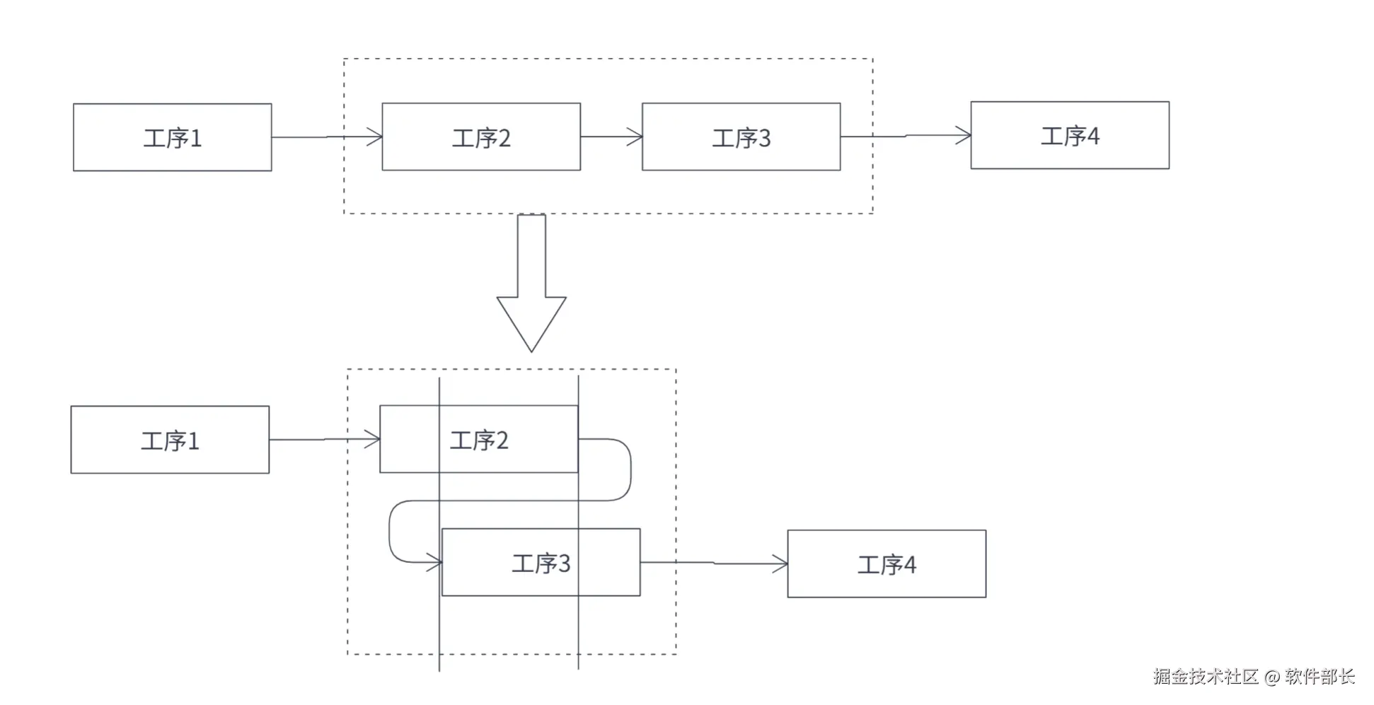 痛点:传统排产认为必须等前工序100%做完,后工序才能开始,这其实造成了严重的资源闲置(即“整批等待”)。实际上,当前工序完成一部分周转量时,后工序就可以提前介入,如下图所示: