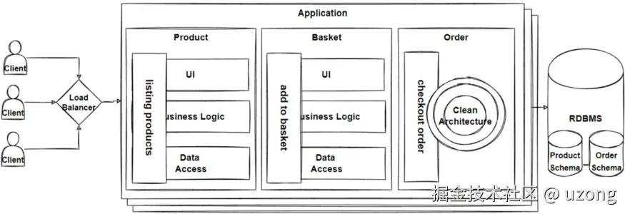 - 在单体架构中,整个应用程序被构建为一个单一、紧密集成的单元