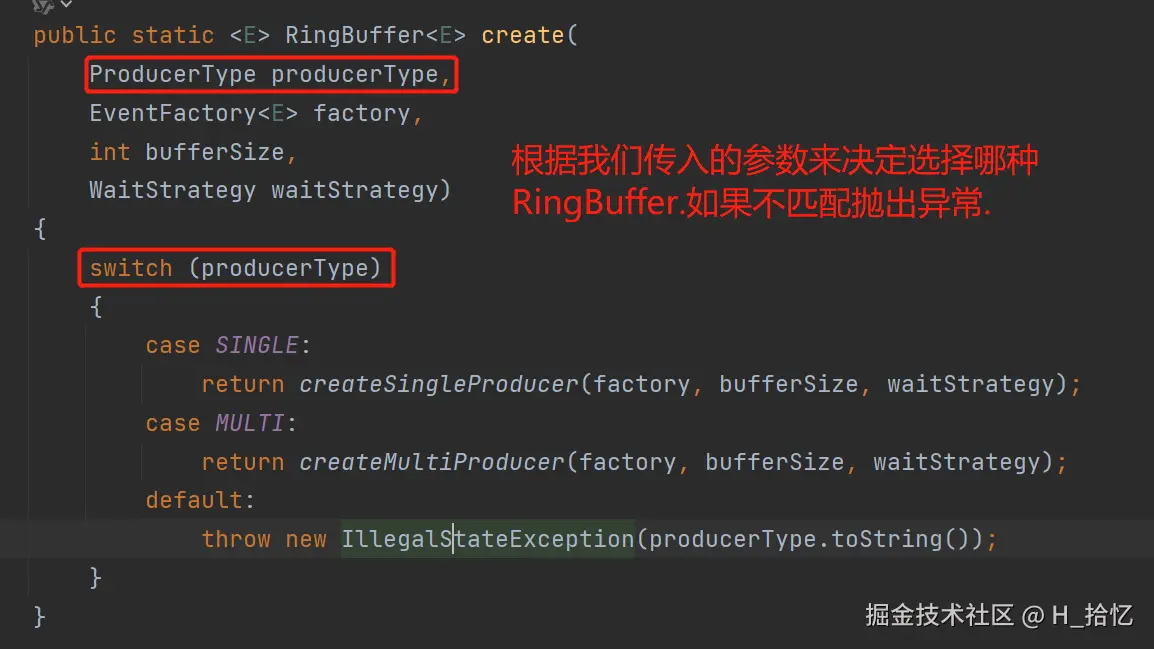 RingBuffer.create(producerType, eventFactory, ringBufferSize, waitStrategy),