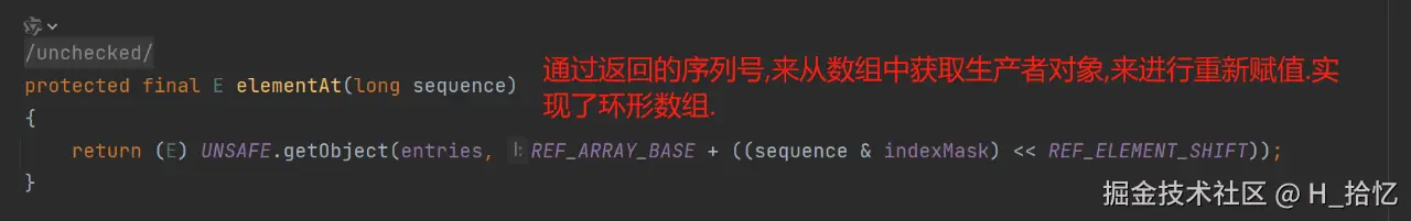 return (E) UNSAFE.getObject(entries, REF_ARRAY_BASE + ((sequence & indexMask) << REF_ELEMENT_SHIFT));