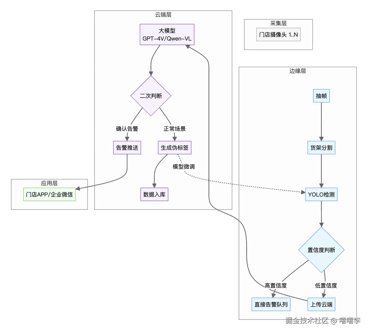 边缘端负责实时检测,低置信度样本上传云端大模型复核,伪标签数据回流持续优化边缘模型,实现端云协同闭环。
