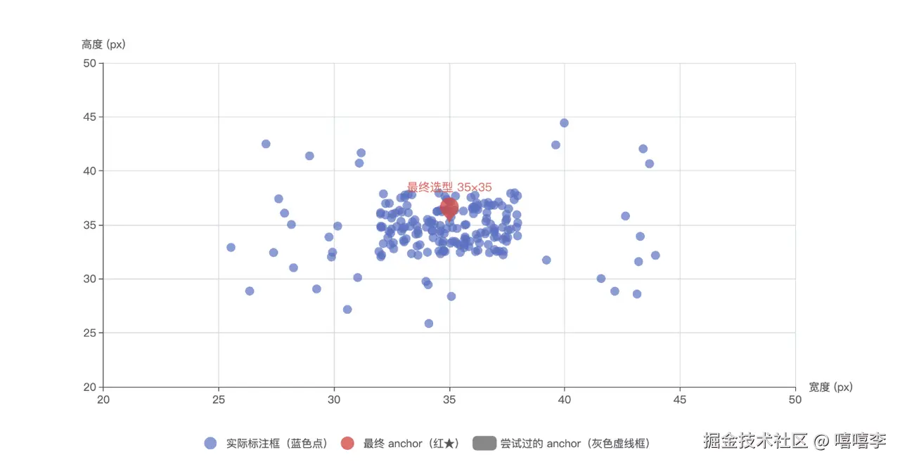 标注框数据高度集中在 35×35 区域,先尝试 30×35 anchor 效果不佳,最终选用 35×35 作为最优检测框尺寸。
